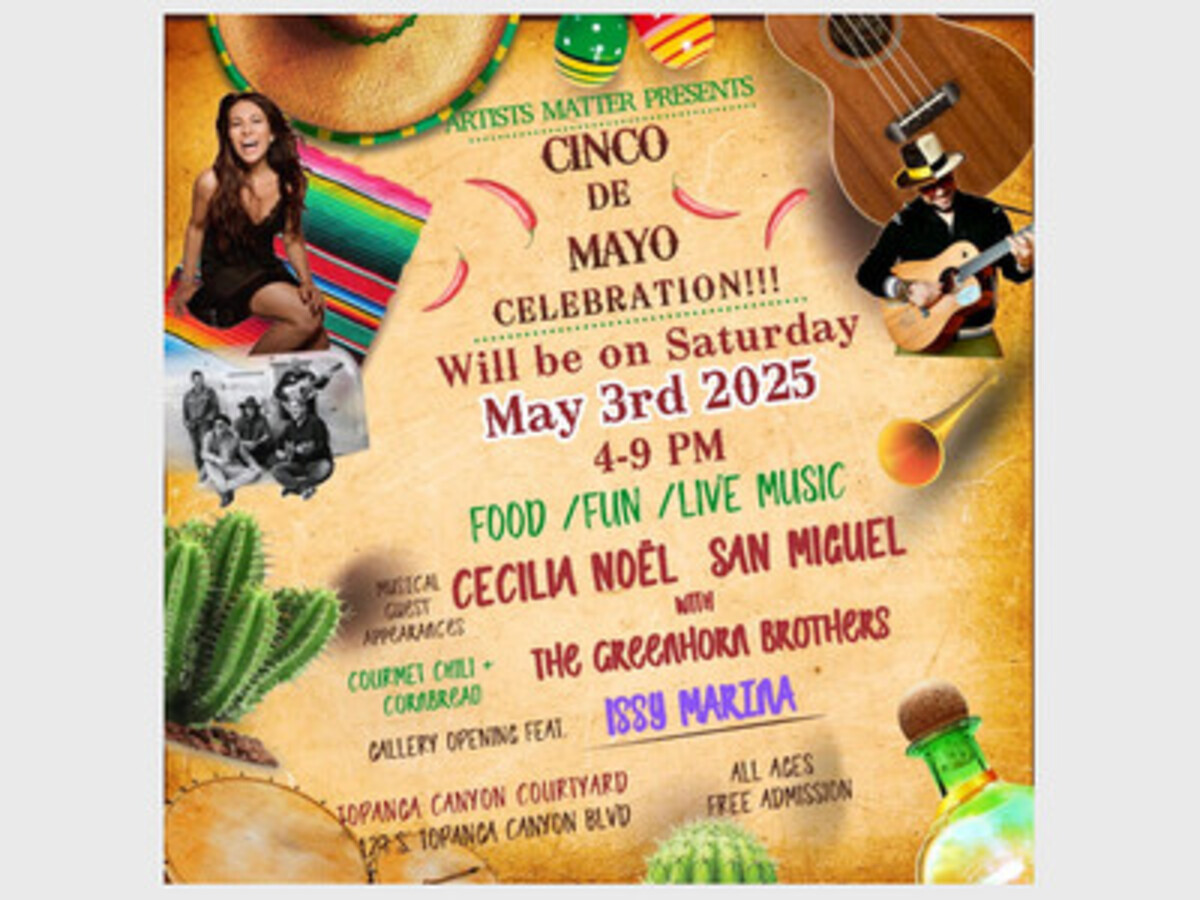 Artists Matter and The Topanga Canyon Courtyard Present Cinco De Mayo Celebration !!!! Come out and support Artists Matter's Gallery Grand Opening exhibiting amazing paintings by Artist Issy Marina & Musical performances by Cecilia Noël San Miguel, Greenhorn Brothers and special guests. There will be gourmet chili with cornbread. All the vendors will be open. BELOVE Apparel, Topanga Candle/Mercantile, Busto & Sun Custom Hats and others. Free Admission.