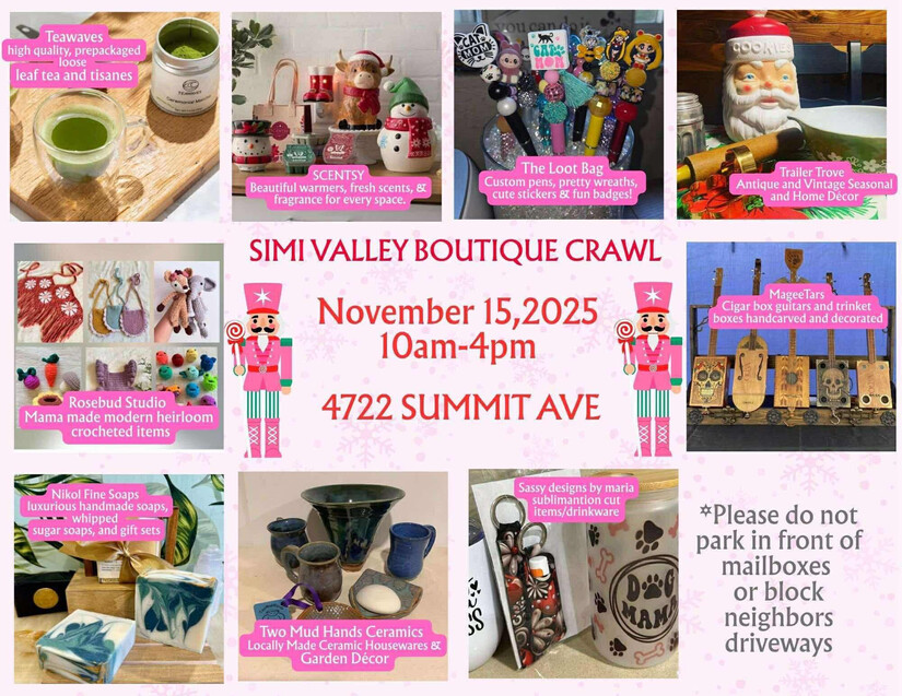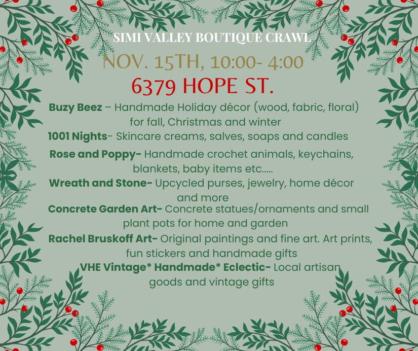Welcome to the Simi Valley boutique crawl. We started this in Dec 2020 during Covid with all our wonderful boutiques being cancelled, we decided to try this instead. After all, we couldn’t let all our talented makers rely strictly on online sales. It was a GORGEOUS day and fun was had by all. And a tradition was born. We usually have 6-12 locations and 70-120 vendors selling jewelry, delicious treats, personalized gifts 🎁 , home decor and so much more.