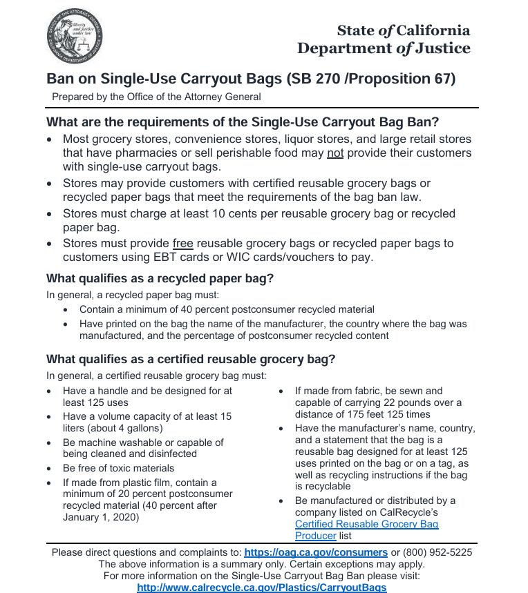 The statewide ban on single-use carryout bags prohibits most grocery stores, large retail stores with a pharmacy, and convenience stores that sell food and alcoholic beverages from providing their customers with bags designed for a single use only, unless those bags are made with recycled paper. Instead, these stores generally must provide customers recycled paper bags or certified reusable grocery bags and must charge their customers at least 10 cents for each bag. The text of the bag ban statute can be found on the California Legislative Information page. Single-Use Carryout Bag Ban (SB 270) - CalRecycle Home Page Bill Text - SB-270 Solid waste: single-use carryout bags.