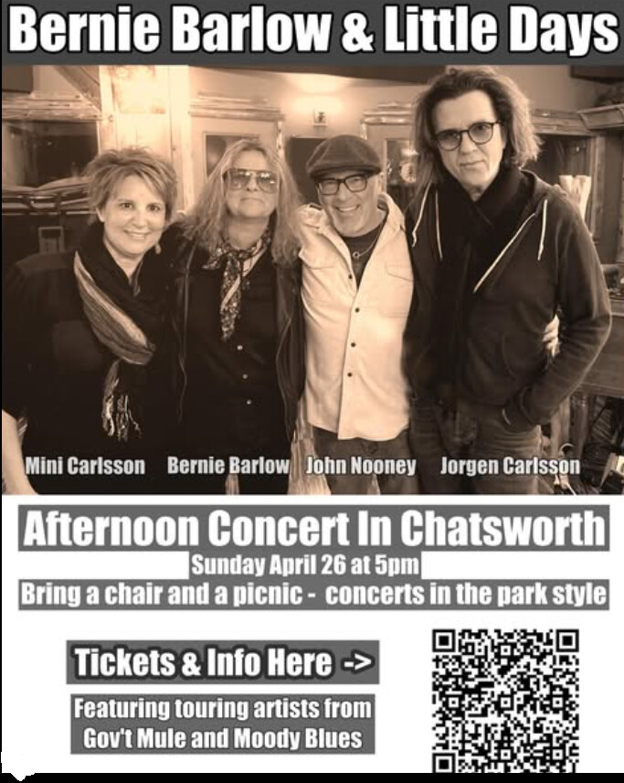 Bernie & Little Days Music & John Nooney Music will be sharing the stage and performing songs from their albums ! With former touring artists from GovtMule, MoodyBlues & many more . Promoted by My Creative Outlet - Chatsworth