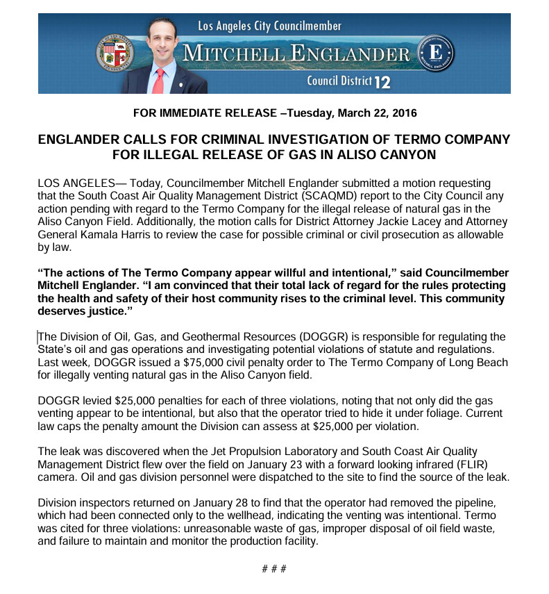 2016 November 1 Sherman Responds to SoCalGas Push to Resume Operations at Aliso Canyon in Porter Ranch